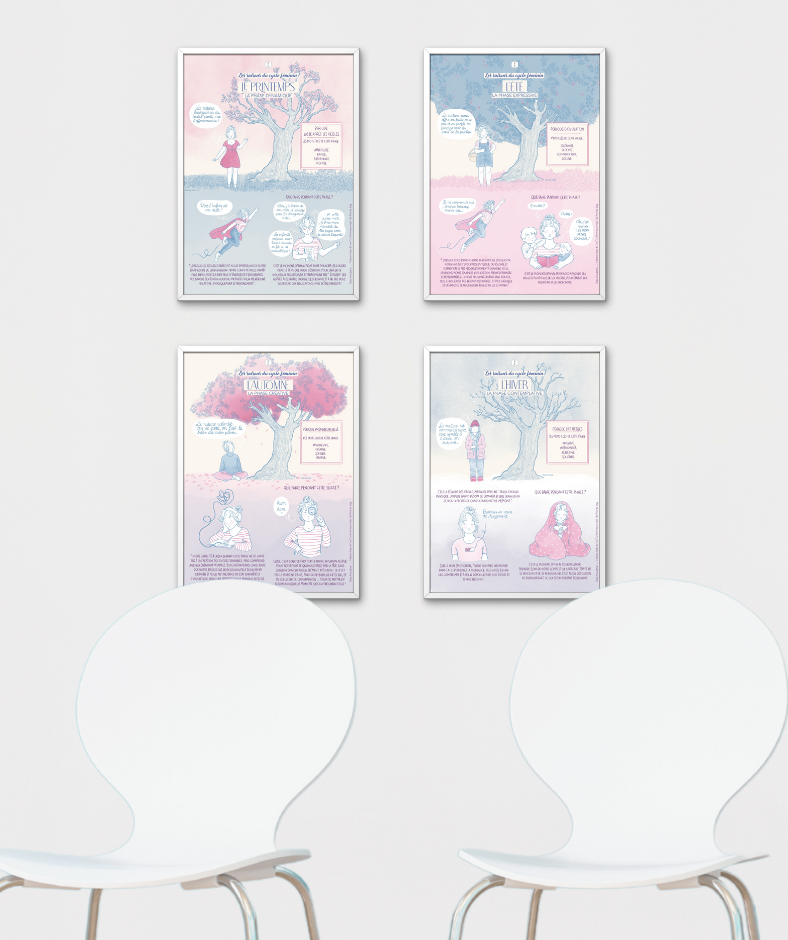Lot de 4 affiches A4 qui présentent les 4 saisons du cycle féminin.